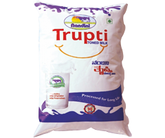 Trupti toned milk is Nutrition protected UHT treated milk with min3.5% fat and 8.5% SNF well suited for preparation of coffee and tea. It is packed in 5 Layer flexi pack under aseptic conditions for 90 days of shelf life.